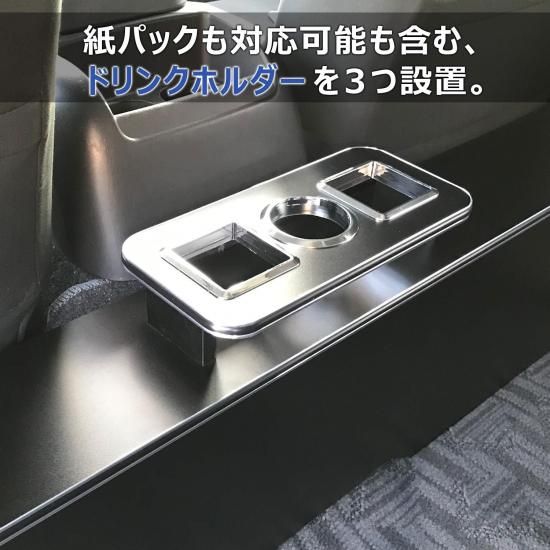 ポイント | ・セカンドシートがまるで別空間!! ・マットブラックエンボス仕様+メッキモールで、高級感溢れるデザイン! ・見える面は全てマットブラック化粧仕上げ ・ドリンクホルダーは、パックが入る四角型×2、缶やペットボトルが入る丸型×1 ・マジックテープでしっかり固定。車両を傷つけません ・【200系ハイエース スーパーGL専用設計】だから、しっかりフィット! スライドドアを開けたときも、車両とセカンドテーブル取付面の隙間は見えません ・プロダックス製人気のセンターコンソール( 200-HG40 )と同時装着可能!(※200-HG41は同時装着不可) |