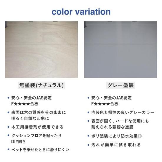 | 材質 | F★★★★合板(塗装コンパネ/グレー) 汚れが取れやすくなり、強度が増します。 F★★★★で身体にも安心なものを使用しています。 |