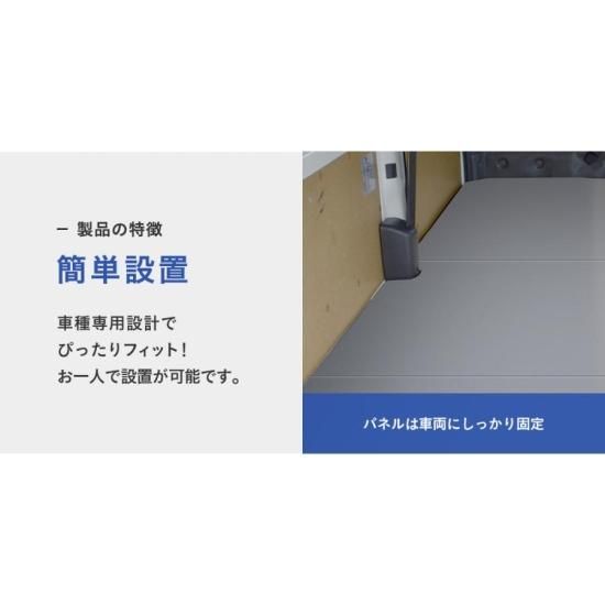 | 取付方法 | 取付は荷室へフロアパネルを置き、パネル同士を連結するだけでとても簡単です。 短時間で取付が可能です。(取付説明書を同封いたします。) |