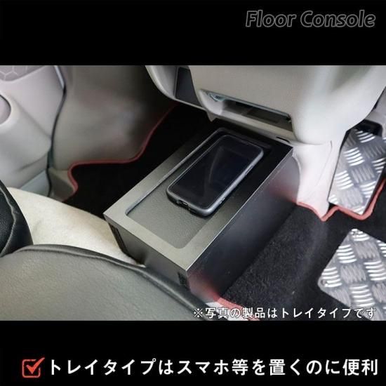 | 商品について | 運転席と助手席間の床に設置するコンソールです。 小さなデッドスペースを活かすことのできる、便利アイテム。小物入れの機能に加え、上部の仕上げをドリンクホルダもしくはスマホ等が置けるトレイから選ぶことができます。 |