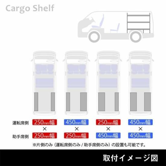 | 商品について | 車両、グレードごとに型取りをした専用設計の収納棚で、車両を加工することなく取り付けることが可能です。 運転席側と助手席側がそれぞれ独立しているので、運転席側のみ設置するケースや助手席側だけを設置するなど、積載物やお車の使用用途に合わせてお選びいただけます。 棚の奥行は450mm幅・250mm幅の2タイプからお選びいただけます。棚に荷物をたくさん積載する場合は450mm幅を、荷室中央部の積載性を重視される場合は250mm幅をご選択ください。 中段・下段の棚位置は固定。上段の棚は、高さを4段階から選択して取り付けます。 色は、無塗装と黒から選択できます。 |