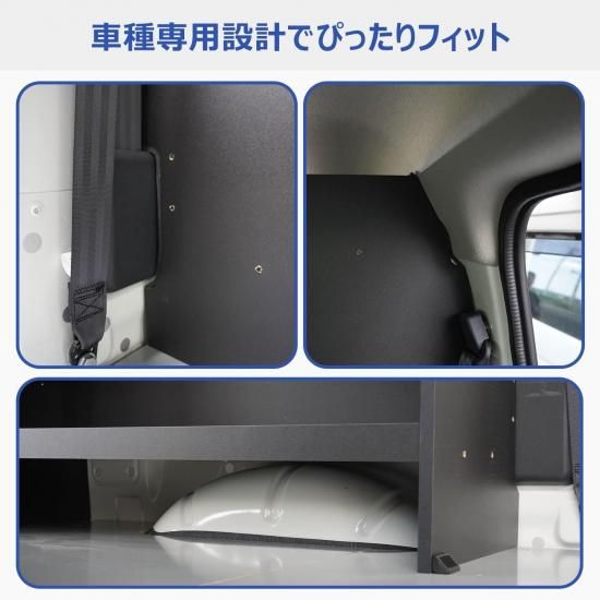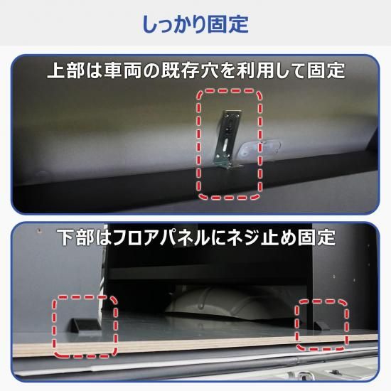 | 取付方法 | ※本製品はお客さまによる組立式となります。 組立・取付の目安時間としては、2人で1時間程度です。 プラスドライバー・ゴムハンマー・10mmスパナ・クリップ外しをお客さまにてご用意ください。 ※本製品の取付前に、フロアパネルを車体に取り付けてください。 フロアパネルの無い車には取付できませんのでご注意ください。 1.本体を組み立てます。 2.クリップ外し等で荷室内のクリップを外します。 3.組み立てた本体を車両に載せ、位置を合わせます。 4.ステーで本体上部を車体に固定します。 5.コーナーフィットでフロアパネルと本体を固定して完了です。 (詳しくは取付説明書をご確認ください。) |