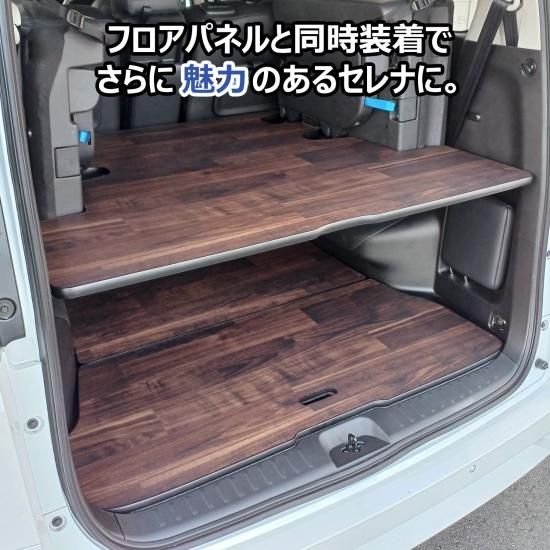 特徴 | セレナのトランク、ラゲッジスペースを2段にして積載量をアップさせる便利グッズ。 キャンプなどレジャーや旅行に。積載量が大幅にアップ。 デュアルバックドアからも、らくらく積載。 セレナ専用設計でピッタリフィット。 国内自社工場製造の日本製。 品質に自信があります。 安価なプラスチック製ではなく、木製の安定感と高級感をお楽しみください。 表面は、丈夫な重歩行用素材を使用。 フロアパネルと同時装着でさらに魅力のあるセレナに。 |