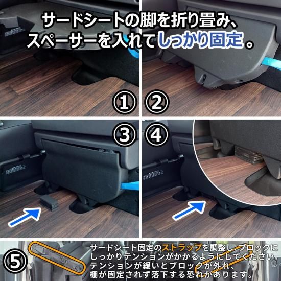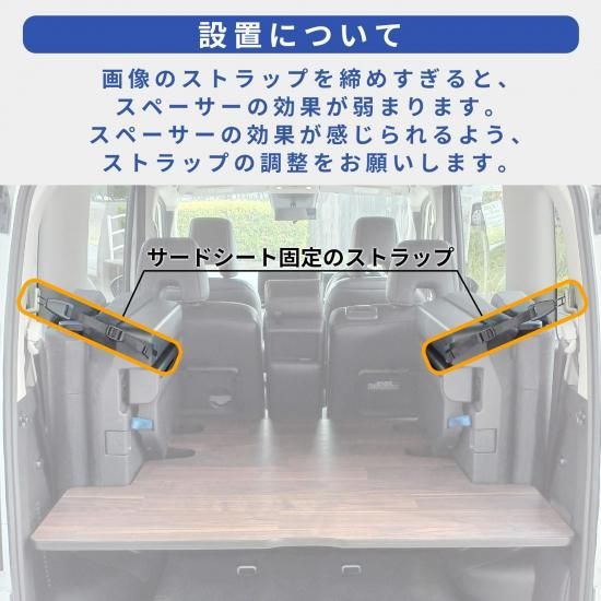 ご注意 | ・サードシート固定のストラップを調整し、ブロック(スペーサー)にしっかりテンションがかかるようにしてください。テンションが緩いとブロックが外れ、棚が固定されず落下する恐れがあります。 ・安全にご使用していただくために、取り付け説明書を確認していただき、走行前に点検をお願いいたします。 |