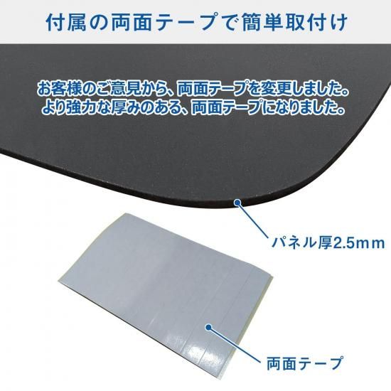 | 取付方法 | 1.両面テープを貼らずに取付位置を確認してください。 2.ガラスクリーナー等でウィンドウパネルの取り付け面、ウィンドウパネル本体の汚れを取り除いてください。 3.ウィンドウパネル本体に両面テープを貼り付け、剥離紙の上から指で強く押して圧着させてください。 4.剥離紙を剥がし、車体に貼り付け圧着させてください。 圧着が不十分ですと走行中に脱落の恐れがあります。 貼り付け直後は接着力が弱く、十分な接着力が発揮されるまで24時間程度かかります。 詳しくは取付説明書をご確認ください。 |