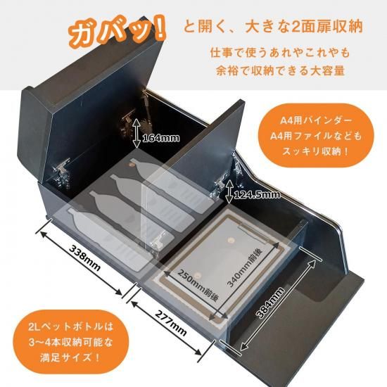 | ポイント | 【ガバっと開く大容量の2面扉収納】 A4バインダーやファイルはもちろん、仕事で使う様々なアイテムもすっきり収納可能。2Lペットボトルなら3〜4本収納できる大満足サイズ。 【ふわっと閉まるスマート設計】 ソフトダウンステーとダンパー付き丁番、ワンタッチステーを採用し、扉が静かにスムーズに閉まります。 【マルチ対応ドリンクホルダー】 缶、ペットボトル、紙パックに対応した使いやすい設計です。 【選べる3カラー展開】 お好みに合わせて選べる、ブラックレザー/ピアノブラック/ダークウッドの3タイプ。 |