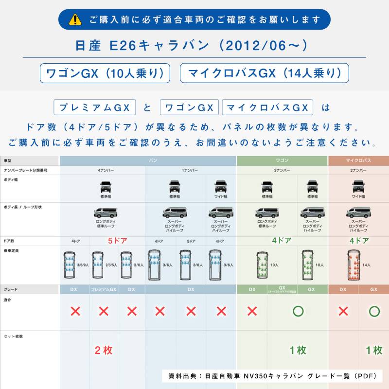 | 適合車種 | 日産 E26 NV350 キャラバン ・ワゴンGX ロングボディ 標準幅 ・ワゴンGX スーパーロングボディ 標準幅 ・マイクロバスGX スーパーロングボディ ワイド幅 |