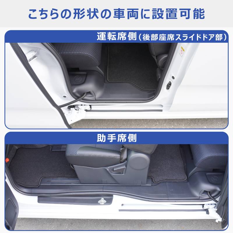 | 取付方法 | 1、ステップシートを仮置きして設置する位置や向きを確認します。 2、サイドシルカバー部分をクリーナーで脱脂し、付属の両面テープを貼り付けてください。 3、両面テープの剥離紙を剥がします。 4、ステップシートを確認した位置に置き、しっかり固定されるように圧着させます。 (詳しくは取付説明書をご確認ください。) |